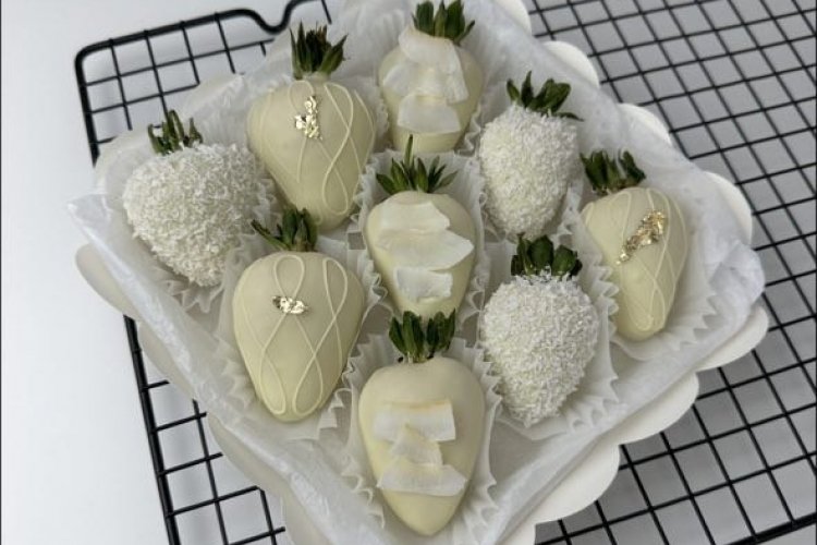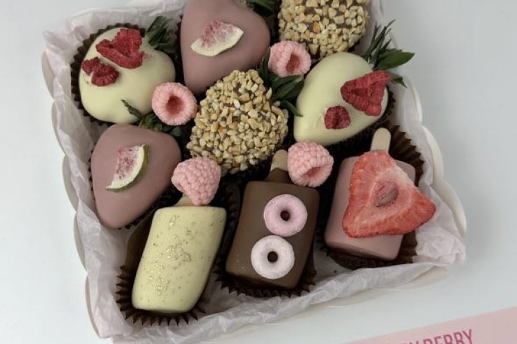 Состав: клубника свежая, бельгийский шоколад Callebaut: рубиновый, белый, обезвоженная гортензия.